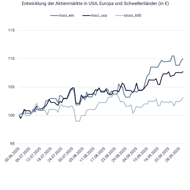 Nach dem starken, aber nur kurzen Rücksetzer Anfang April infolge der massiven Zollankündigungen von US-Präsident Donald Trump setzten sich die positiven Signale an den internationalen Aktienmärkten im dritten Quartal fort. Allen voran schritt der breite US-Aktienindex S&P 500 von einem Allzeithoch zum nächsten und schloss mit einem Plus von 7,8 % in den letzten drei Monaten (seit Jahresbeginn: +13,7 % in US-Dollar, aufgrund der Dollarschwäche im ersten Halbjahr jedoch lediglich 0,2 % in Euro). Noch stärker legte der technologielastige US-Aktienindex Nasdaq Composite zu: +11,2 % im Quartal (seit Jahresbeginn: +17,3 % in US-Dollar, 3,4 % in Euro).
