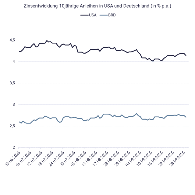 Ein weiterer Kurstreiber für US-Aktien im dritten Quartal waren die sinkenden Zinsen. Bereits Ende August signalisierte Jerome Powell (Präsident der US-Notenbank Fed) in Jackson Hole Bereitschaft für eine Lockerungen der Geldpolitik. Die Risiken hätten sich Richtung Arbeitsmarkt verlagert. Im September zeigte eine Revision: Die US-Wirtschaft schuf in den letzten zwölf Monaten fast eine Million Stellen weniger als zunächst gemeldet. Gleichzeitig verharrt die jährliche Inflationsrate weiter klar über dem 2-%-Ziel: Im August lag sie bei 2,9 %. Angesichts dieses Zielkonflikts senkte die Fed den US-Leitzins im September um 0,25 Prozentpunkte und stellte weitere Schritte bis Jahresende in Aussicht.