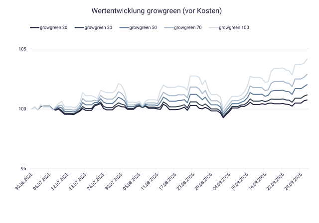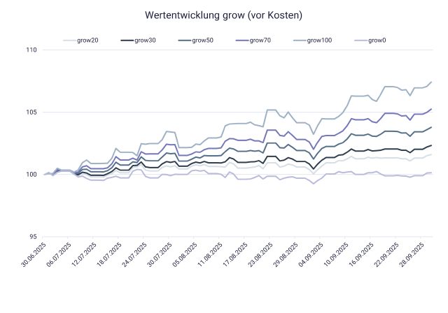 * Die Performance im 3. Quartal 2025 zeigt jeweils die Entwicklung einer Einmalanlage bei maximalen Kosten. Für Investments ab 50.000 Euro, die ETF-Rentenversicherung oder Sparpläne ergibt sich eine abweichende Rendite. Die komplette Wertentwicklung für die Anlagestrategien finden Sie hier. Die Entwicklung für die reine Anleihestrategie growgreen0 darf erst mit dem Quartalsbericht Q4/2025 veröffentlicht werden - wenn die Strategie länger als ein Jahr besteht.