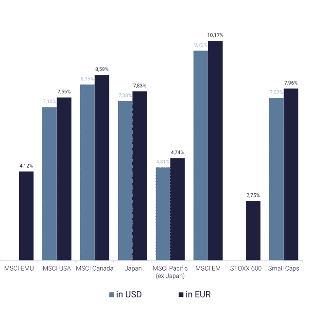 Besonders stark trugen die ETFs mit Aktien aus Entwicklungsländern (+ 10,17 % in Euro), mit kanadischen Aktien (+ 8,59 %) und mit Aktien aus dem Segment Small Caps (+ 7,96 %) zur Rendite bei. Die weltweite Diversifizierung der Geldanlage macht sich hier sehr positiv bemerkbar.