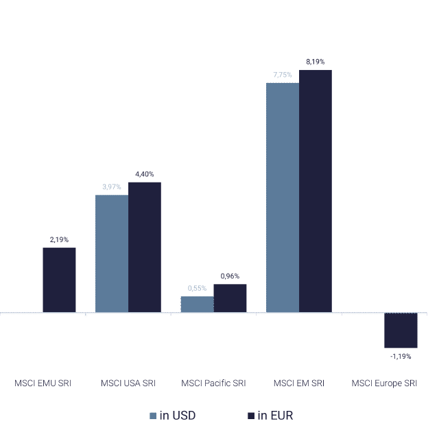 Bei den ETFs auf nachhaltige Aktien entwickelten sich ebenfalls die Schwellenländer (Emerging Markets) mit + 8,19 % besonders stark. Ebenfalls deutlich positiv waren die ETFs auf nachhaltige US-amerikanische Aktientitel (+ 4,40 %). Schwach performten dieses Quartal Aktien aus Europa mit - 1,19 %.